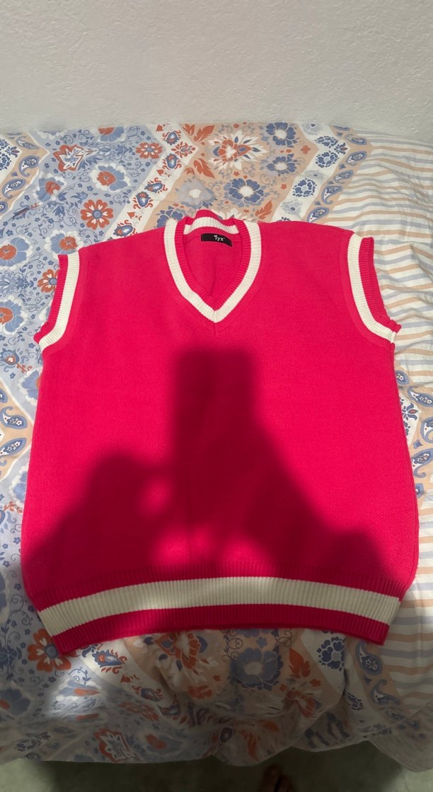 Kırmızı renkli, V yaka ve örgü dokulu, sentetik kumaştan yapılmış, salaş kesim kadın süveter. Günlük ve sokak stiline uygundur.