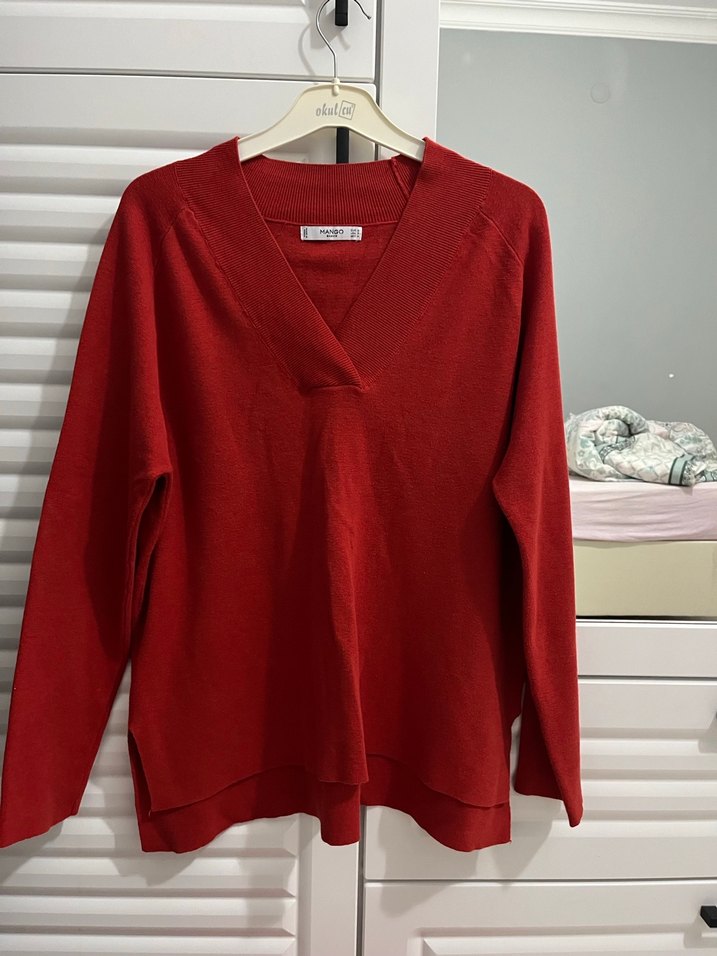 Kırmızı turuncu arası bir renk özelden fotoğraf atabilirm yep yeni duruyor gıcır yeni Koyu kırmızı, V yaka ve uzun kollu, pamuktan örülmüş, bol kesimli bu kazak midi boyda ve minimalist tarzda günlük kullanıma uygundur.