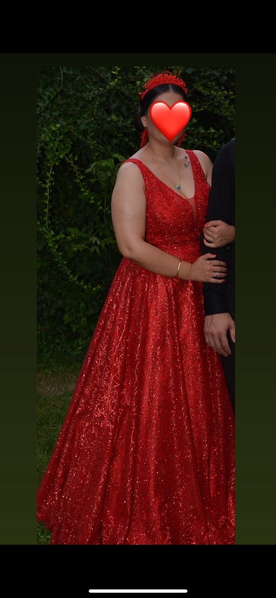 Taç ve küpe içinde dahildir Kırmızı, V yakalı, kolsuz, parlak ve desenli kumaştan, düğünler için uygun, vücuda oturan kına elbise. ✨