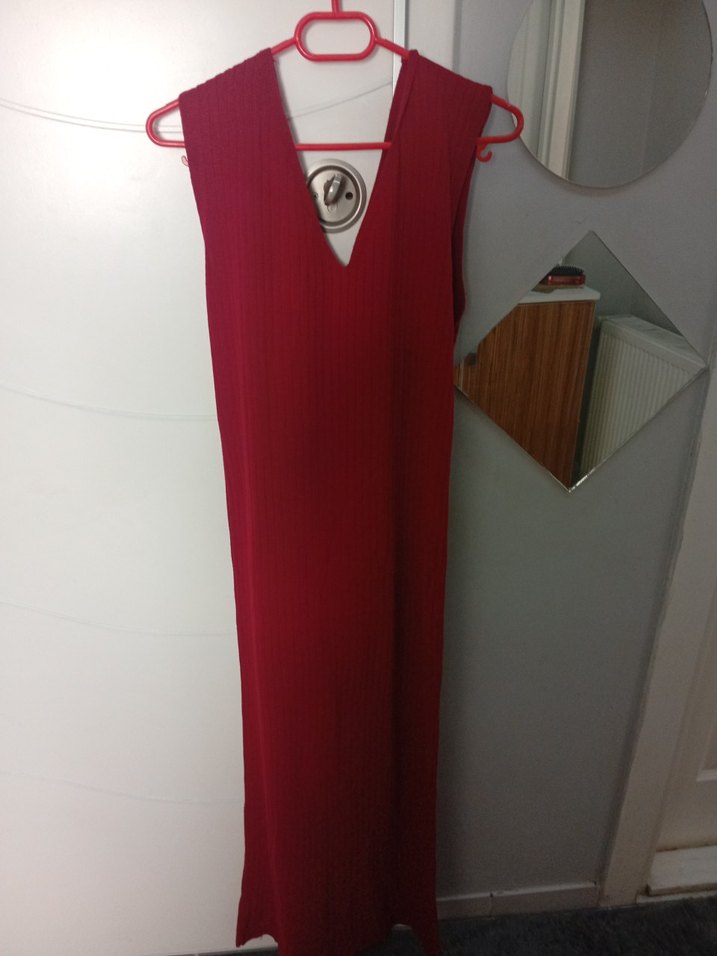 Kırmızı uzun elbise, V yaka ve kolsuz tasarıma sahip, piliseli detaylarla süslenmiştir. Pürüzsüz sentetik kumaştan yapılmış, sade ve bohem tarzda, rahat kesimdir. Günlük kullanım için uygundur.