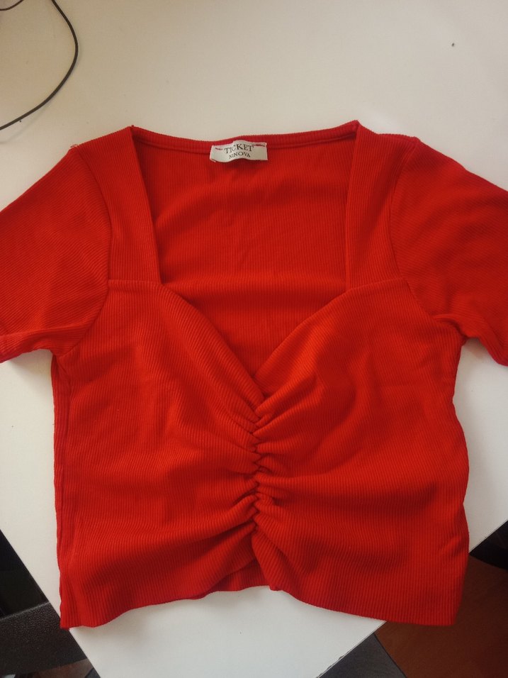 V yaka, kısa kollu kırmızı bluz, pliseli detaylara ve parlak görünüme sahiptir. Normal midi boyda, trend sokak tarzı için uygundur.