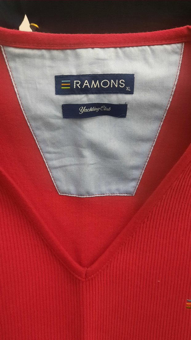 Kırmızı V yaka sweatshirt, iç kısmında RAMONS ve Yachting Club etiketleri bulunan gri detaylar içerir. Streetwear ve athleisure tarzlarını yansıtır. ⚓