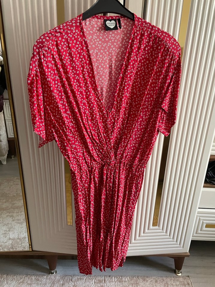 Kırmızı tekstil kumaştan, V yakalı, salaş kesim ve kısa kollu. Hafif batik desenli, drapeli tasarım, romantik akşamlar için ideal. Bir kere giydim. Sorunsuz yeni