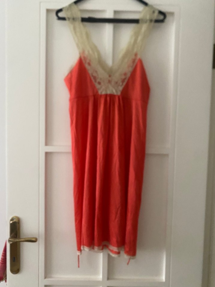 Kolsuz, bol kesim midi gecelik, pastel kırmızı / nar çiçeği renkte olup V yakada zarif dantel detaylarıyla vintage bohem tarzını yansıtır. Fransadan alındı