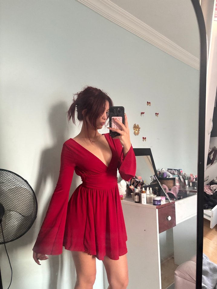 Bu kırmızı, v yaka ve uzun transparan kollu mini elbise, gösterişli tarzıyla romantik akşamlar için uygundur. Şortludur