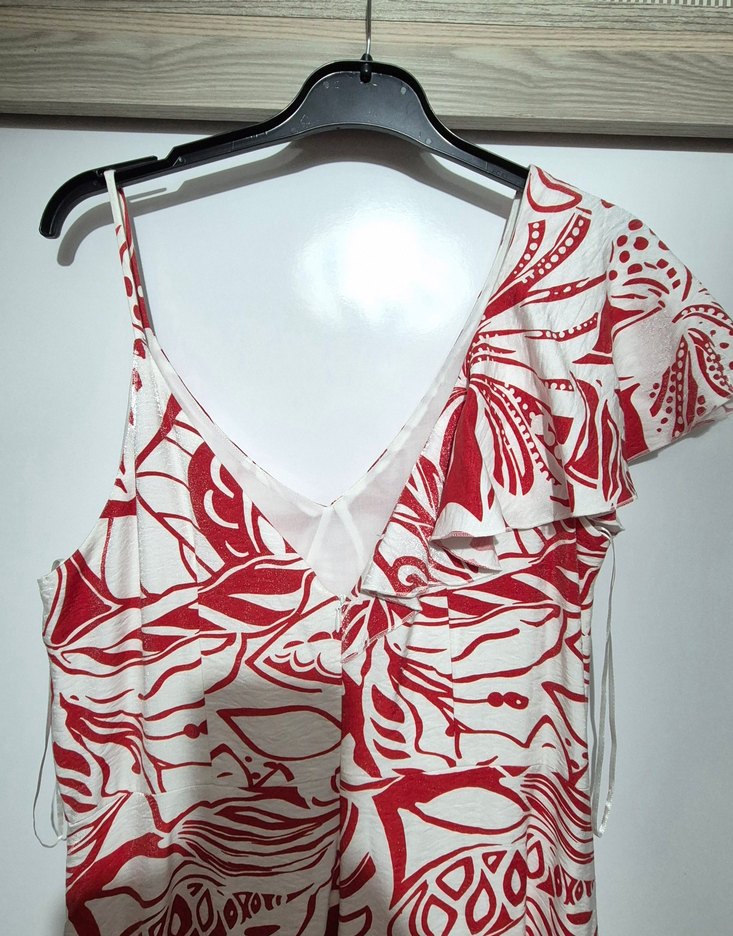V yaka ve kolsuz, tek omuzda fırfır detaylı, kırmızı desenli, midi kesim, kumaştan yapılmış, bohem tarzda fit harika bir elbise