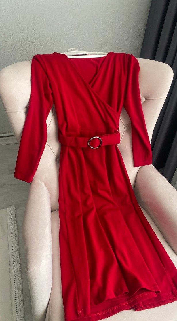 Parlak kırmızı renkte, V yakalı ve triko vücuda oturan kesimde diz altı elbise.Kemer detaylı her alana kullanım sağlayacak şıklıkta.