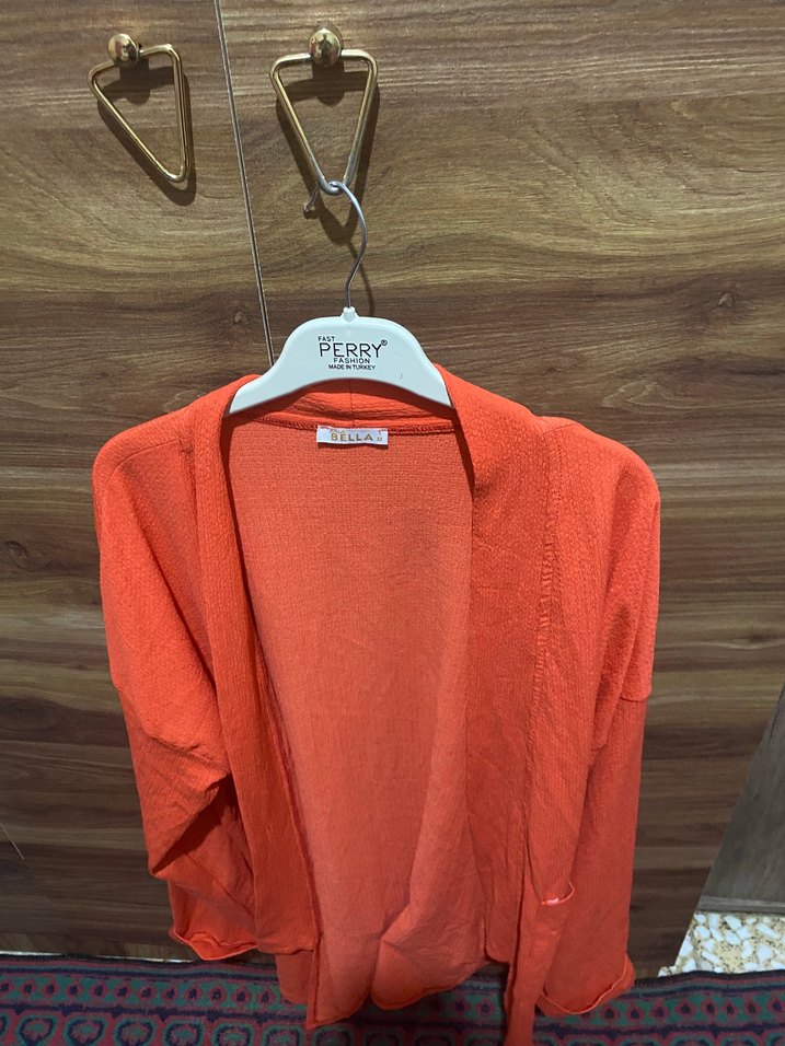 Kırmızı, triko dokulu, keten kumaştan üretilmiş, bol kesim, uzun kollu ve V yakalı rahat hırka. Günlük sokak modası için uygun.