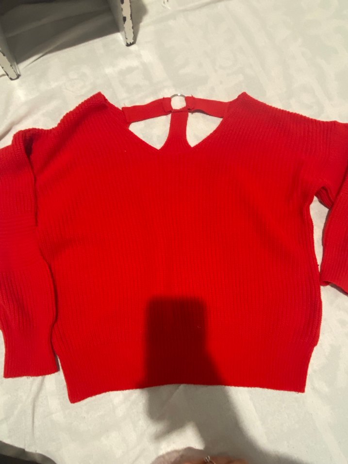 Kırmızı, V yaka, uzun kollu ve triko dokuma kadın kazak. Sırtında anahtar delik detaylı, günlük rahat sokak stiline uygun, tam oturan kesim.