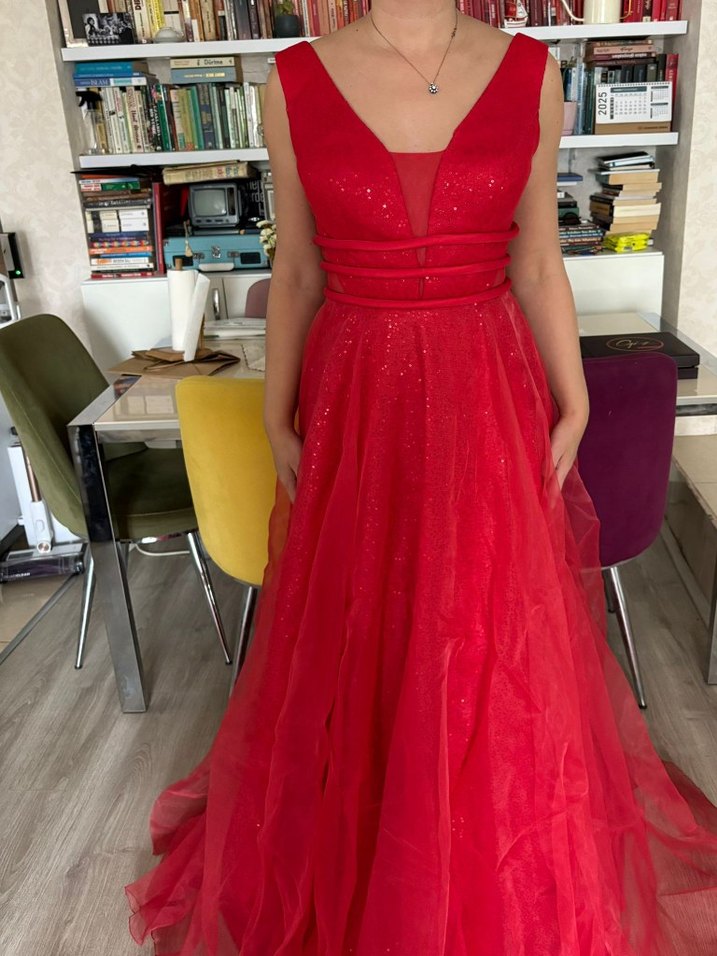 Parlak kırmızı, V yakalı ve kolsuz, drapeli detaylara sahip uzun ve vücuda oturan abiye elbise. Düğün ve özel davetler için uygundur. ✨ Elbise yalnızca 1 saat giyilmistir.