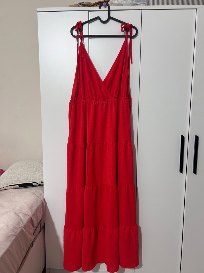Kırmızı uzun askılı elbise, V yaka ve bol kesimle drapeli tasarıma sahiptir. Yumuşak keten Romantik akşamlar için uygundur. Salaş bir yapısı var. Ben 50 bedenken denedim 42 bedenim şuan hala oluyor. Rengi benlik olmadığı için satıyorum. Hiç giymedim. 1300 tl gibi bir fiyata almıştım.