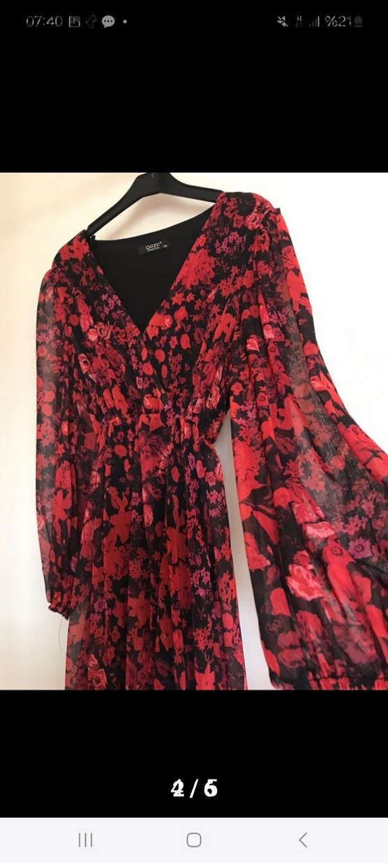 Kırmızı desenli, V yakalı, uzun ve bol kesim bohem elbise, drapeli uzun kollu, romantik akşamlar için uygun.