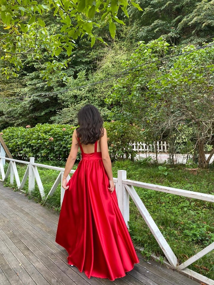 Kırmızı, drapeli uzun ve v yaka tasarımlı, ince askılı abiye elbise, şık düğünler için uygundur. ✨ özel dikim yalnızca 1 kere giyildi