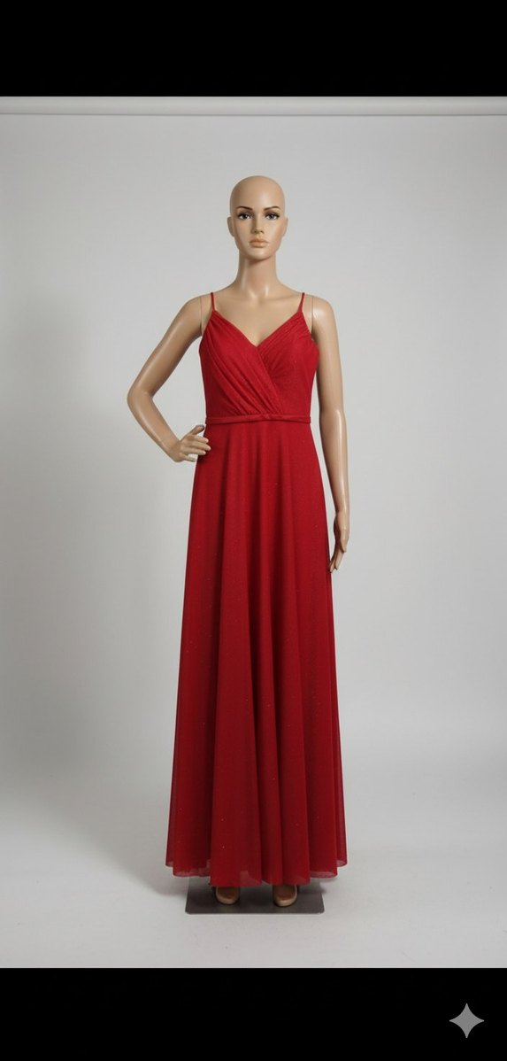 Kırmızı, uzun ve drapeli bu abiye elbise, V yakalı ve ince askılıdır. Düğünler için uygun, parlak ve klasik şıklıkta bir modeldir.