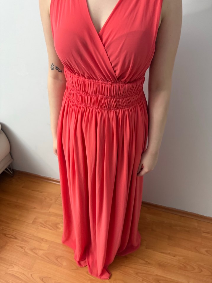 Kırmızı, V yakalı, kolsuz ve drapeli tasarıma sahip, vücuda oturan uzun elbise, cesur ve romantik akşamlar için ideal. 40-42 beden için uygundur.