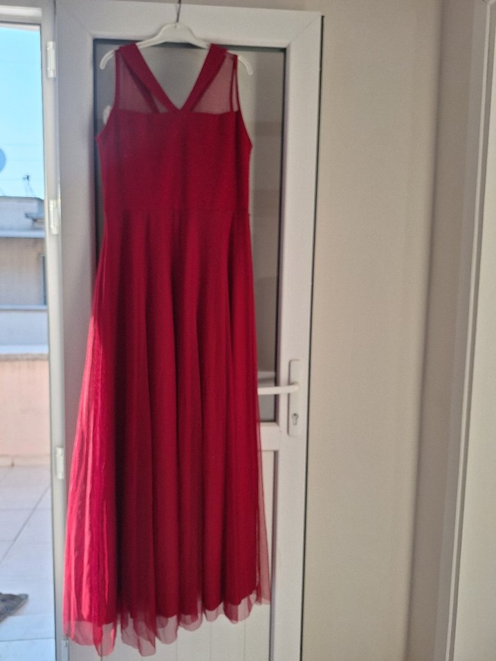 Kolsuz, V yakalı kırmızı abiye elbise, uzun ve drapeli tasarıma sahip. Parlak kumaşıyla düğünler için şık ve çağdaş bir vintage tarz sunar.
