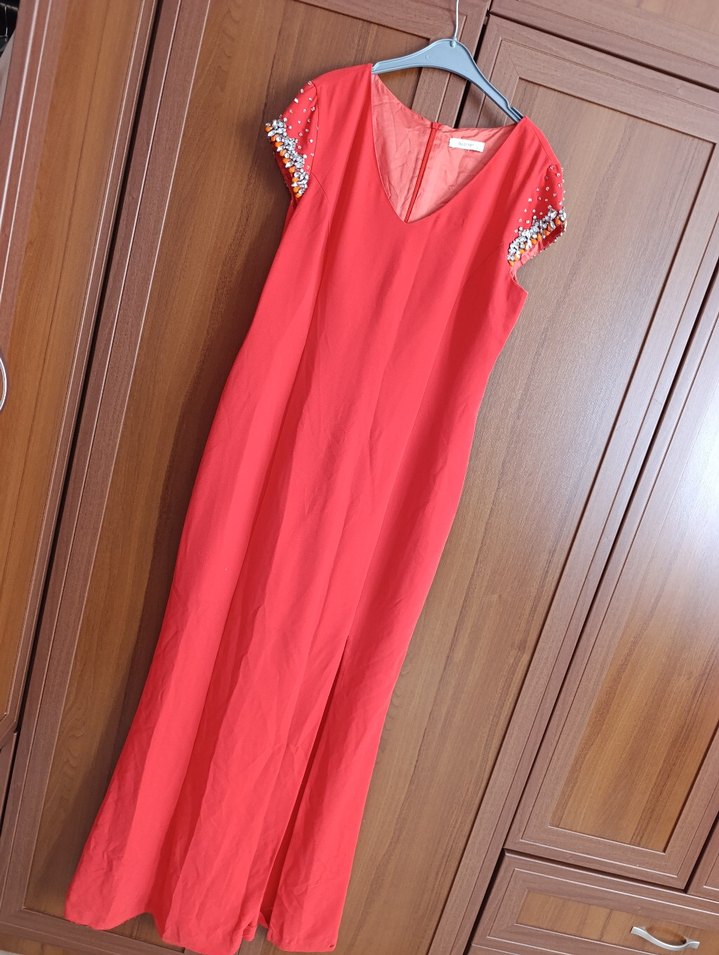 V yaka, kolsuz ve uzun kesimiyle kırmızı elbise, drapeli tasarımı ve işlemeli kollarıyla minimalist ve bohem tarzı bir araya getirir. sadece 1 defa giyildi