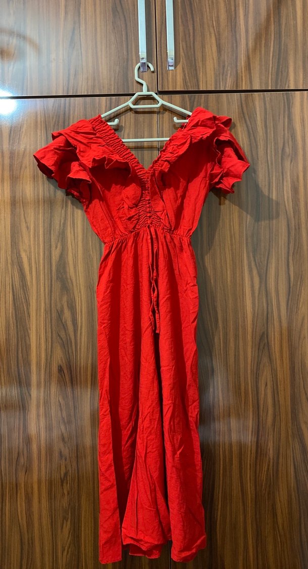 Keten kumaştan, kırmızı renkli, V yaka ve fırfırlı detaylara sahip uzun, kolsuz, bohem vintage tarzda dar kesim elbise. Romantik akşamlar için uygundur.