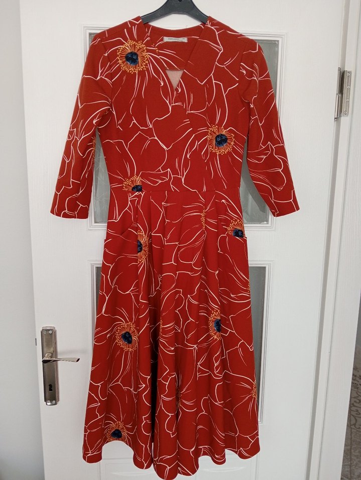Koyu kırmızı tonlarında, uzun kollu ve V yaka, bol kesim, baskılı, drapeli uzun elbise. Romantik buluşmalar için uygun.