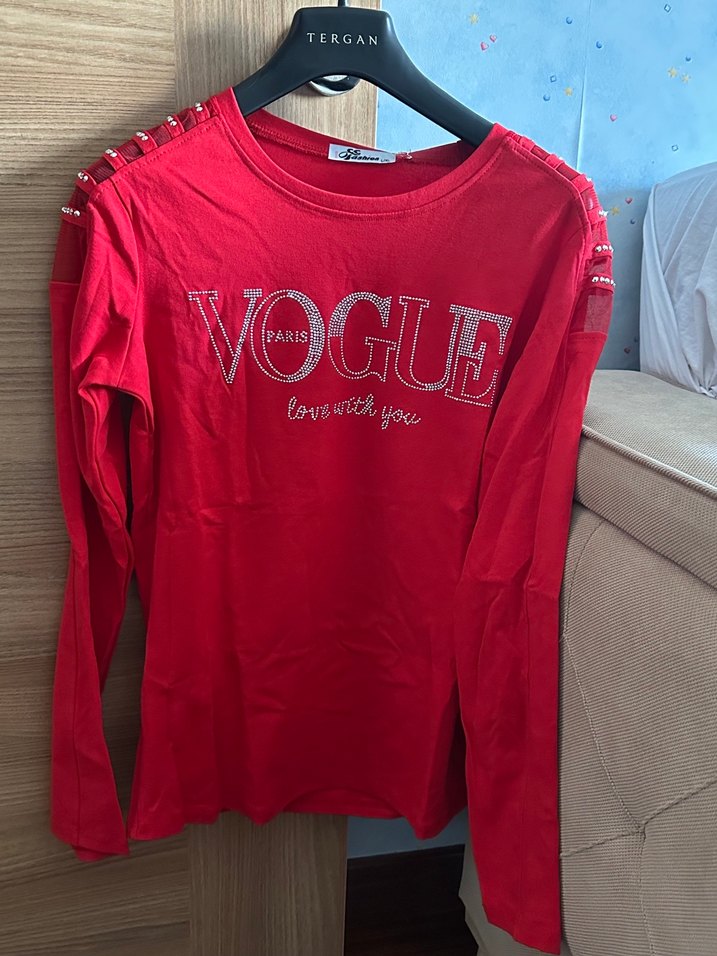 Kırmızı, V yaka ve uzun kollu kadın tişörtü, renkli baskılı 'VOGUE' yazısı ve kol düğmeleri ile rahat kesim, yumuşak sentetik kumaştan üretilmiştir.
