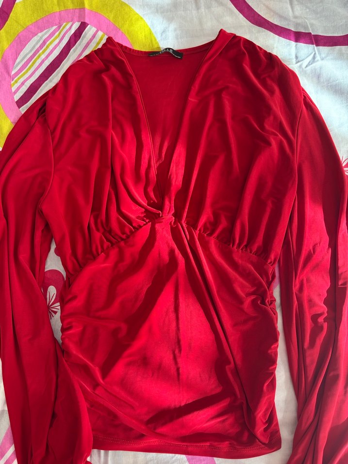 Parlak kırmızı, ipeksi kumaştan, V yakalı ve uzun kollu, bel kısmında drapeli, midi boyda, dar kesim kadın bluz. Sokak stili ve parti için uygun.