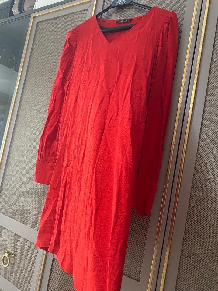 Kırmızı, midi boy, bol kesim, drapeli, V yakalı hamile tuniği. Yumuşak keten kumaştan, günlük kullanım için uygun. Belden kuşaklı