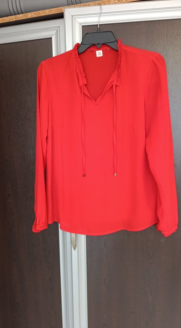 Parlak kırmızı renkte, ince nervür yaka ve kol ucu detayıyla,şıklık ve rahatlığı ön plana çıkartan , uzun kollu, bol kesim, ipeksi dokulu kadın bluz. Günlük kullanıma uygundur. ✨