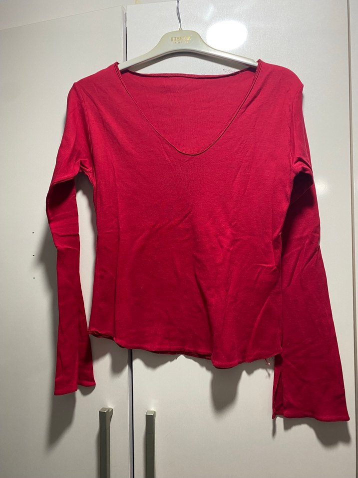 Kırmızı, uzun kollu ve V yakalı bu dar kesim bluz, yumuşak likra kumaştan yapılmıştır. Minimalist, desensiz tasarımı günlük sokak stiline uygundur. İspanyol kol yırtmaçlı