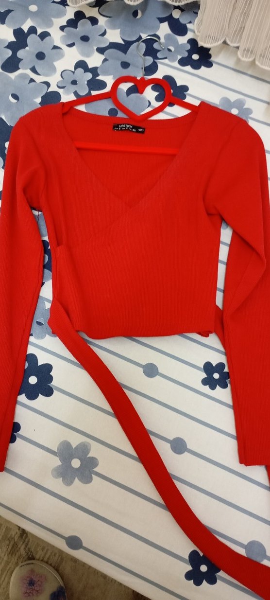 Uzun kollu, V yaka ve fitted kesime sahip kırmızı kadın kazak, sentetik örme kumaştan üretilmiştir. Normal midi boyu ile günlük rahat athleisure tarzına uygundur.