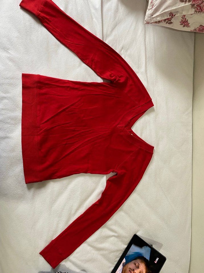 Kırmızı, uzun kollu ve V yaka, yumuşak ve sıcak kumaştan yapılmış, normal boyda, sade tasarımlı kadın kazak. Günlük sokak stili için uygundur.