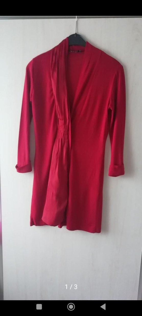 Parlak kırmızı renkte, V yakalı ve uzun kollu, dökümlü tasarıma sahip ipeksi kumaştan midi hırka. Rahat ve bol kesimdir.