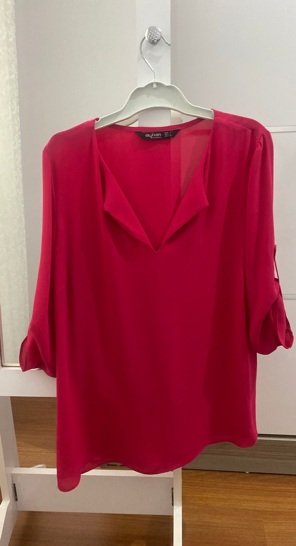 Kırmızı, V yaka ve uzun kollu bu bluz, salaş ve drapeli kesime sahiptir. İpek gibi parlak kumaştan üretilmiş, minimalist ve çağdaş bir tarz sunar. ✨