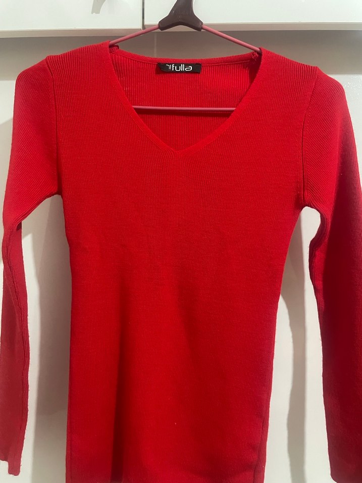 Kırmızı, V yaka ve uzun kollu, yumuşak yün dokulu triko kazak. Günlük kullanım için uygun, normal boyda ve vücuda oturan kesimde.