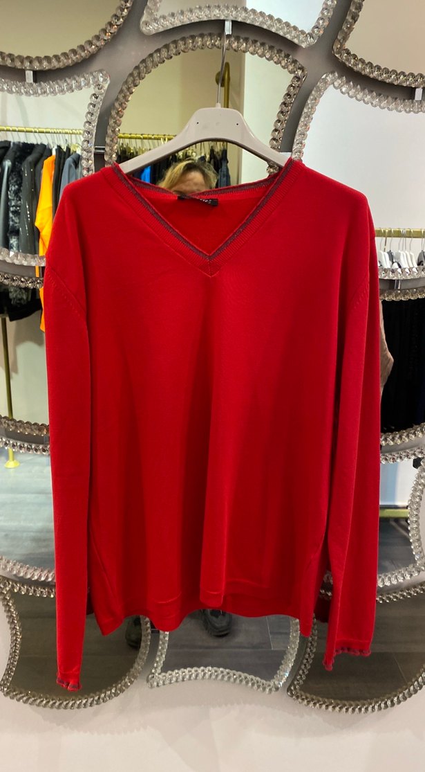 Kırmızı V yaka, uzun kollu ve bol kesim triko kazak. İpek gibi dokusu ve parlak nakış detaylarıyla günlük rahat stil için uygundur.