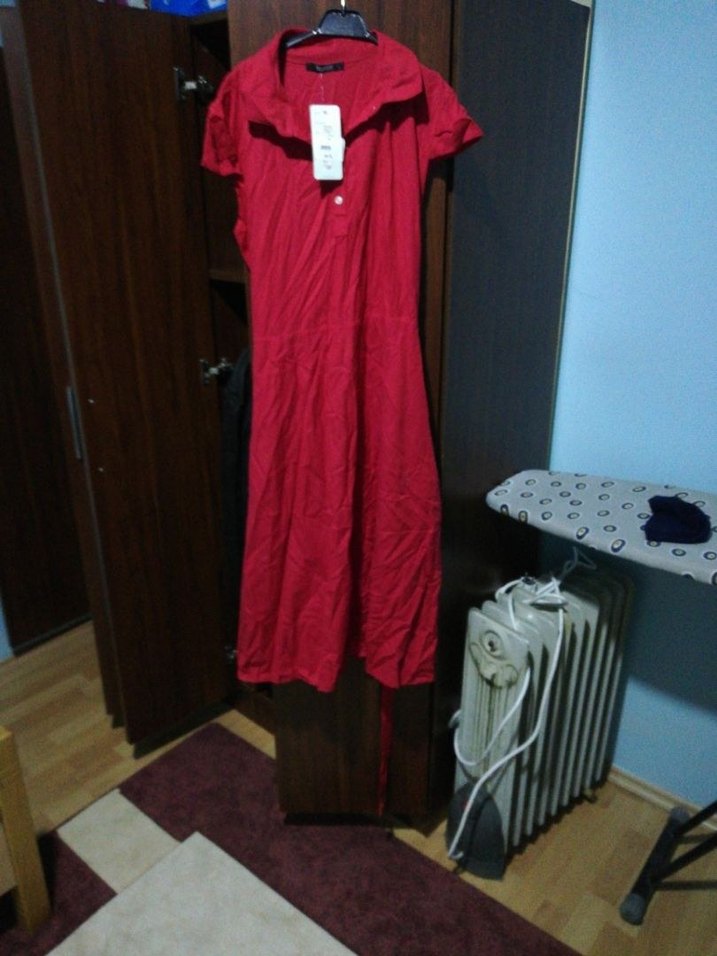 Kırmızı renkte, V yakalı, salaş kesim uzun elbise. Drapeli tasarımı ve yumuşak sentetik kumaşıyla rahat bir günlük stil sunar.