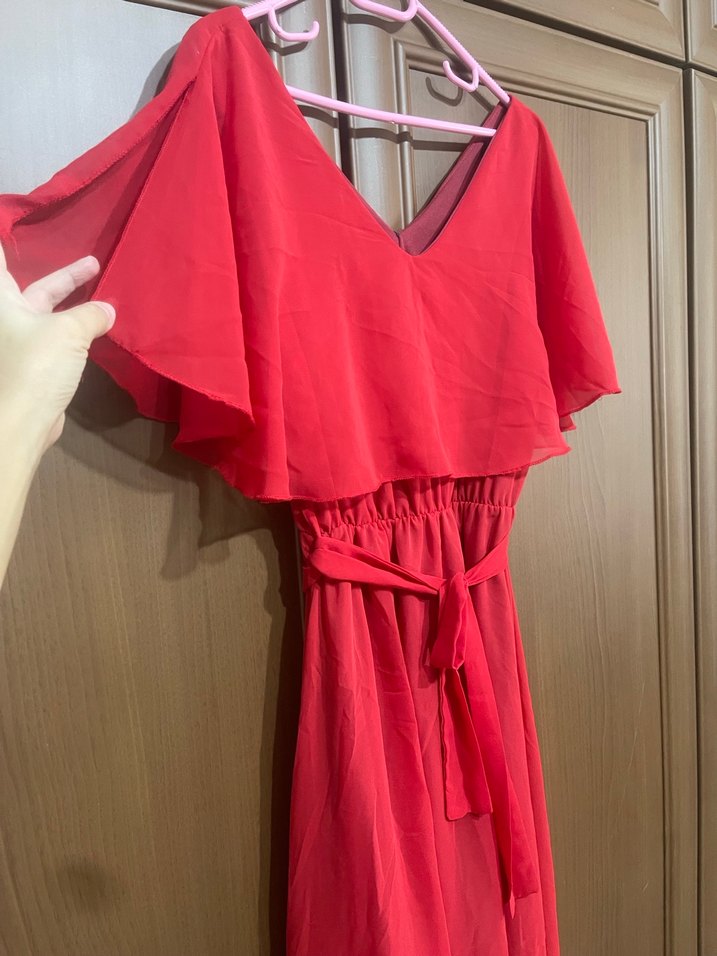 Kırmızı uzun elbise, V yaka ve kolsuz tasarıma sahiptir. Salaş kesim, drapeli detay ve bağlamalı bel ile sentetik kumaştan üretilmiştir.