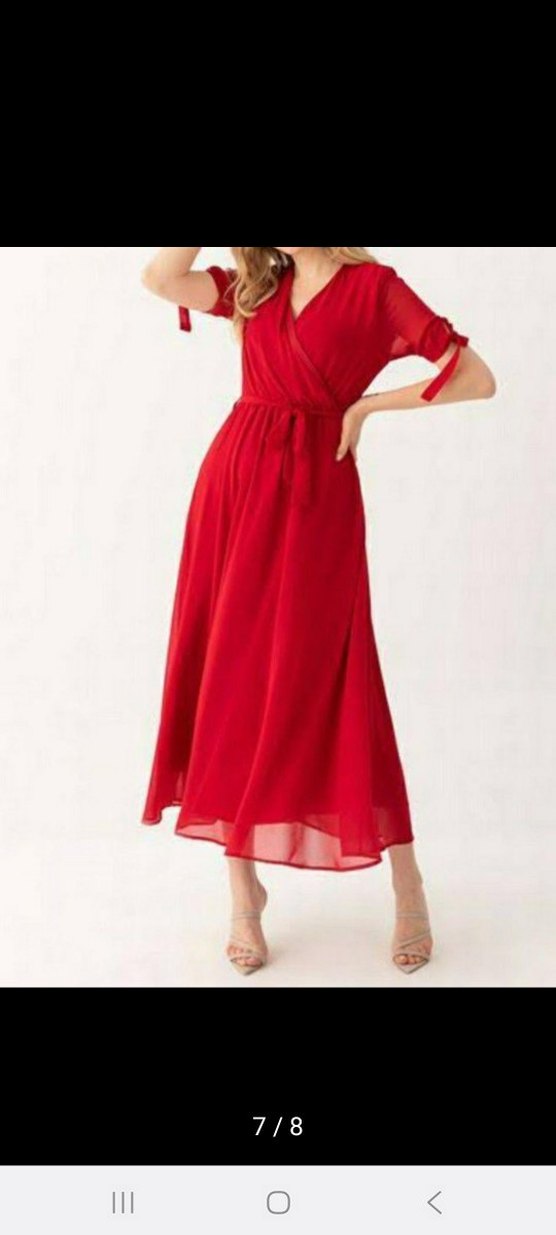 Kırmızı midi boy elbise, V yaka, şifon kumaştan drapeli tasarım ve bol kesim sunar. Görseldekinde farkı etek boyu biraz kısaltıldı. Yakasina çıtçıt eklenmiştir. Düğün, özel gün ve akşamlar için uygundur. Boyu yaklaşık 102 cm.