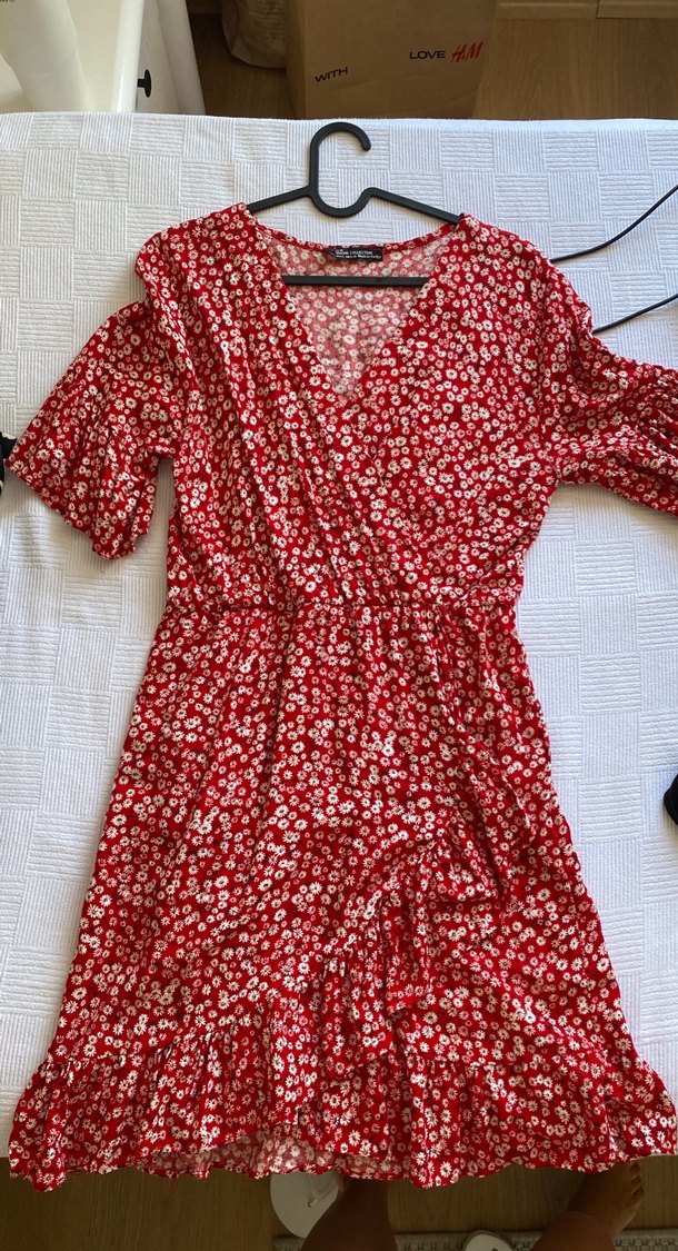 Kırmızı bohem elbise, V yaka ve kısa kollarda volan detayına sahiptir. Rahat kesim ve mini boyda, yumuşak sentetik kumaştan, açık tonlu çiçek desenli. Günlük kullanıma uygundur.