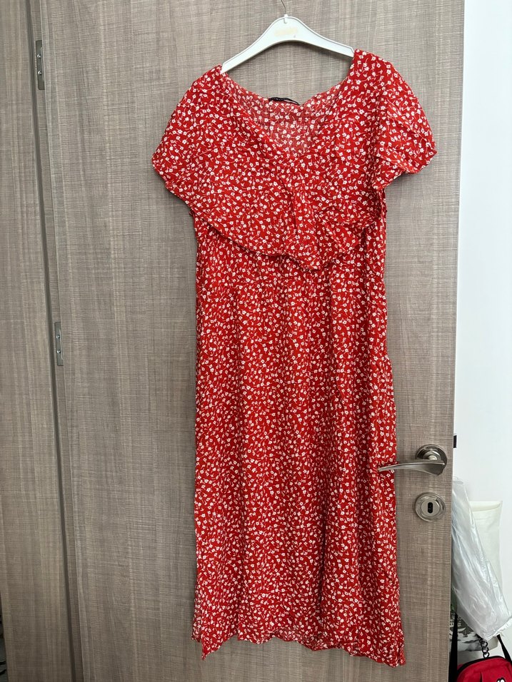Kısa kollu, V yaka ve volan detaylı kırmızı, uzun ve bol kesim elbise. Canlı renkli batik desenli, yumuşak sentetik kumaştan, bohem tarzda günlük kullanıma uygun.