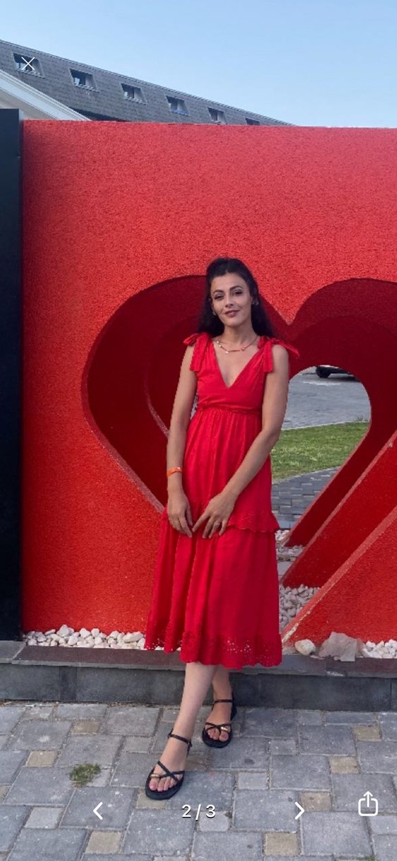 Parlak kırmızı, kolsuz, V yakalı, bohem tarzda, etnik desenli, dökümlü ve bol kesim uzun elbise, romantik akşamlar için uygun.