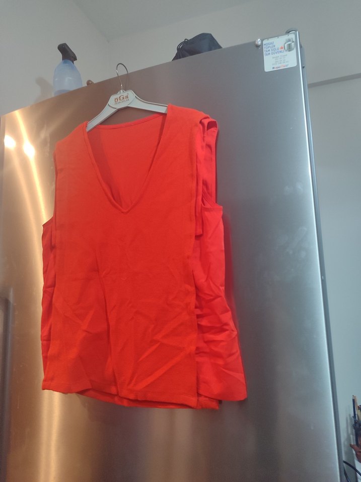 Kırmızı, V yakalı ve drapeli tasarıma sahip, kolsuz ve bol kesim mini bluz. Parlak sentetik kumaştan üretilmiştir, günlük kullanım için uygundur. ✨