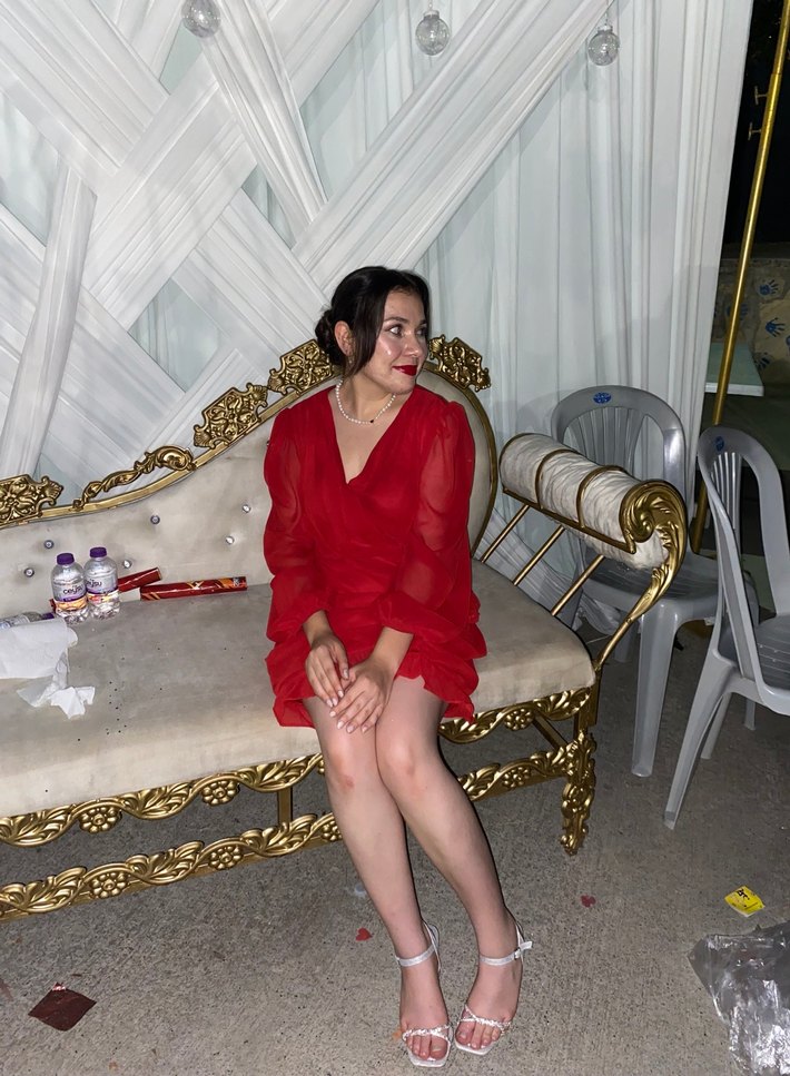Kırmızı, parlak kumaştan yapılmış, drapeli ve V yakalı, strappy kollu, vücuda oturan mini elbise. Romantik akşamlar için uygun.