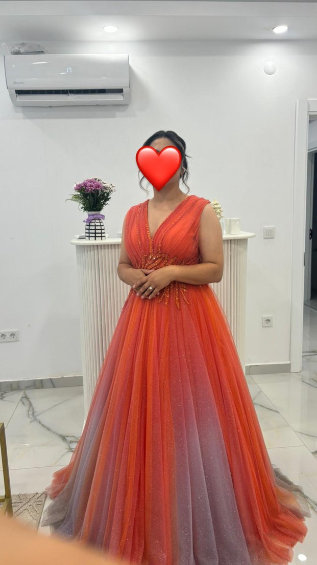 Kolsuz, v yakalı, drapeli ve ince kırmızı tie-dye desenli uzun abiye elbise. Modern klasik tarzıyla şık ve göz alıcı bir seçenek.nişanlık olarak giyildi tarlatan cıkınca elbise olabilir