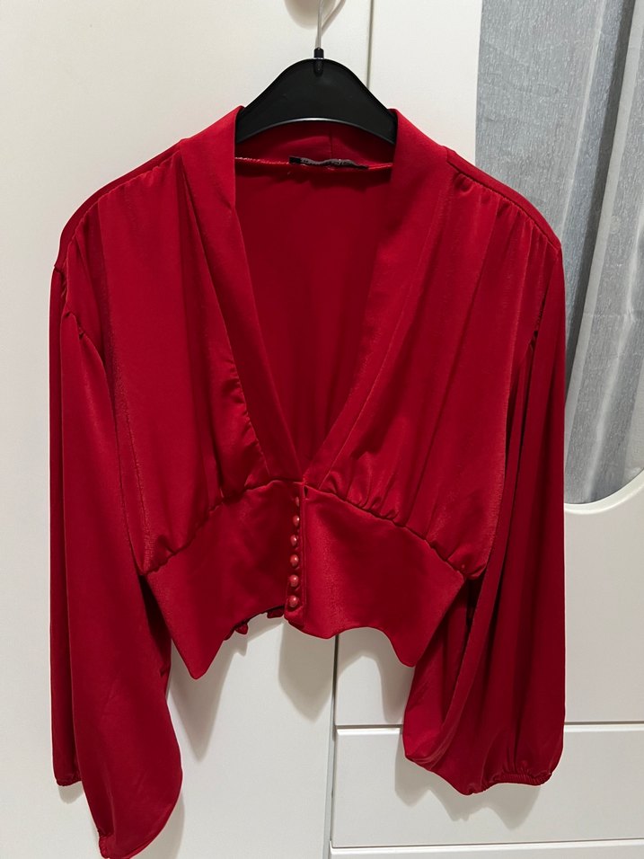 Koyu kırmızı renkte, saten dokulu, düğmeli ve V yakalı uzun kollu, normal boyda dar kesim kadın bluz. Romantik buluşmalar için uygun. ❤️