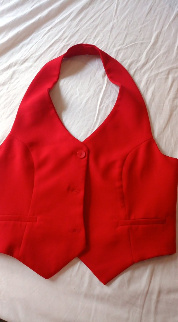 Parlak kırmızı renkte, V yakalı ve düğmeli, kalıplı kadın yeleği. Kolsuz ve yumuşak sentetik kumaştan, ofis kullanımı için uygun. ✨
