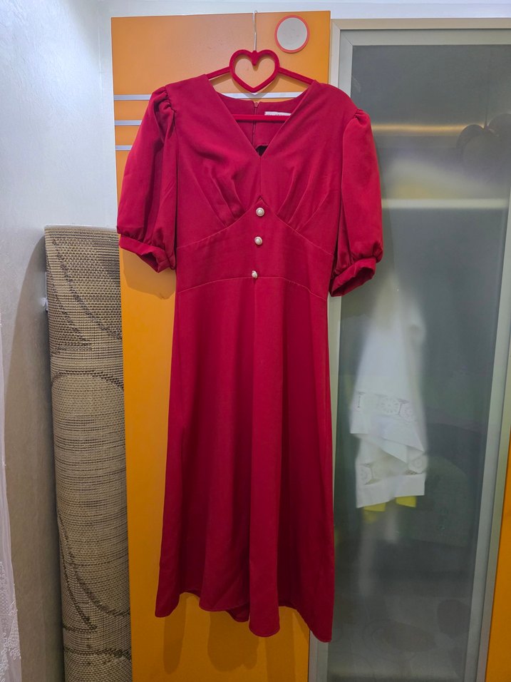 kırmızı midi elbise, V yakalı ve düğmeli ön detaylıdır. ürünün yaka kısmı daha açıktı hafif diktirerek kapattırdım sadece. son fotoğraftaki defosundan başka defosu bulunmamaktadır. dikiş kısmı olduğu için ufak tadilatla halledilebilir.