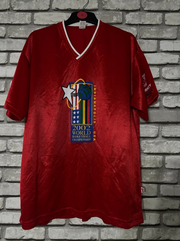 Kırmızı, parlak sentetik kumaştan, bol kesim ve V yakalı erkek spor forması. 2002 Dünya Basketbol Şampiyonası baskılı, kısa kollu, sportif ve iddialı tarz için ideal. İp atmaları var fakat giyime engel değildir.