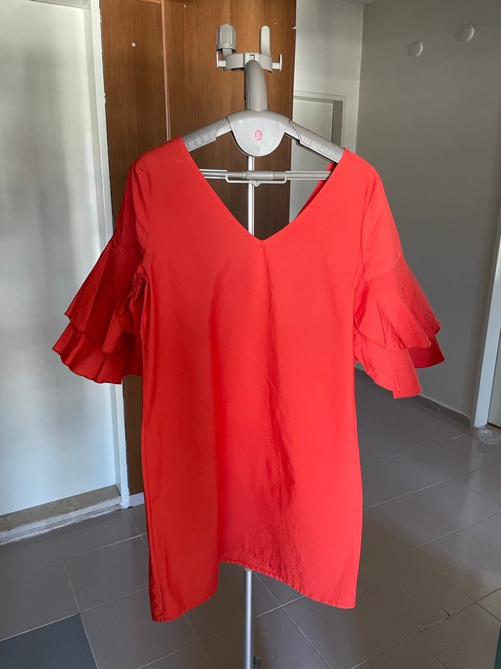 Kırmızı V Yakalı Fırfır kollu turuncu Mini Elbise
