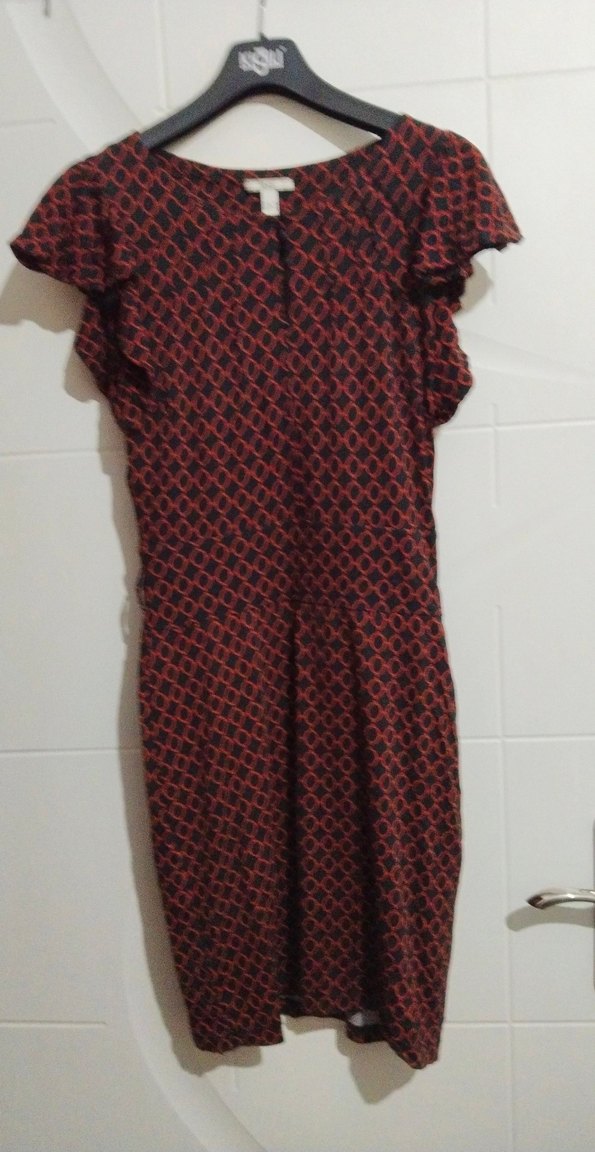 Kısa kollu, V yakalı ve fırfırlı detaylara sahip kırmızı tonlarda bağlama desenli, sentetik kumaştan bohem tarzda uzun ve dar kesim elbise. Ofis kullanımına uygundur.