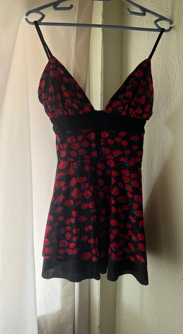 V yakalı, kırmızı koyu tonlarda bağlama desenli, düğmeli ve midi uzunlukta, gotik stilinde, vücuda oturan kolsuz büstiyer. Romantik gece için uygundur.